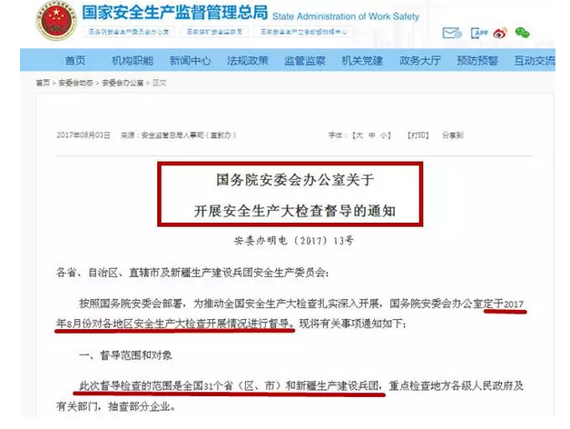 8月3日國(guó)家安監(jiān)局就已發(fā)文:宣布8月初派出16個(gè)督查組對(duì)全國(guó)31個(gè)省(區(qū)、市)展開安全生產(chǎn)大檢查。安全生產(chǎn)大檢查接下來(lái)將連續(xù)督查3個(gè)月,直至10月底結(jié)束。