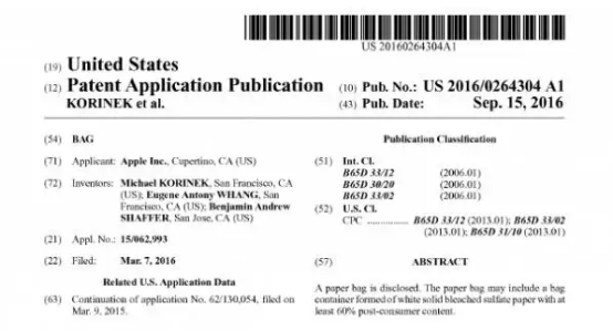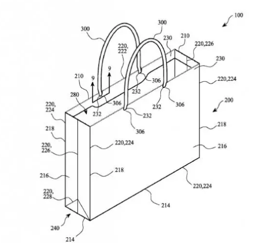 報道稱,美國專利申請號20160264304描繪了其主要特征:“以下的披露與一個袋子有關,就像零售購物袋。它可能完全由紙構成,或許還包含粘合劑?!薄按油ǔS糜谘b物品。比如零售紙袋可以將從零售商店購買的商品包裝起來。”